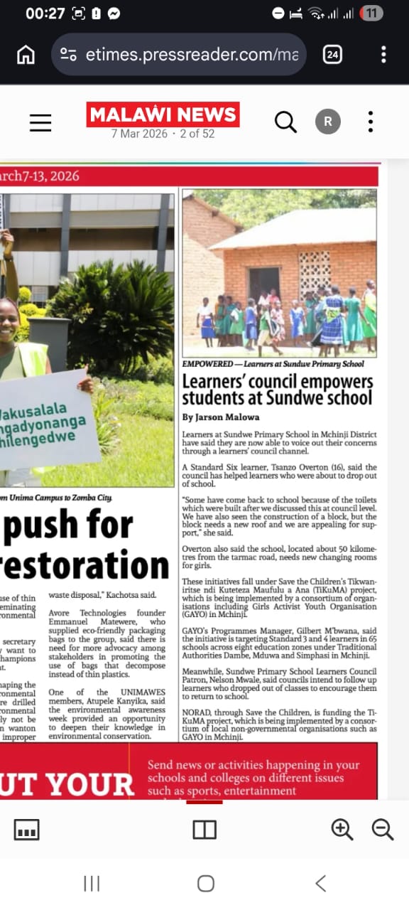 Girls Activist Youth Organization (GAYO) is a leading youth non-profit organization in Malawi’s Mchinji District, dedicated to empowering girls, young women and youths. Established as a club in 2007 and registered as a non-profit organization in 2016, GAYO champions the rights of girls, young women, and youth rights through research, development, entrepreneurship, and community engagement, utilizing ICT and traditional communication methods. GAYO advocates for girls’, young women and youth’s education, promotes self-reliance, and works on projects addressing health, education, livelihoods, Information Communication Technology, child right government, water and sanitation, fostering a conducive environment where girls, young women and youths can thrive and contribute to a just and equitable society.